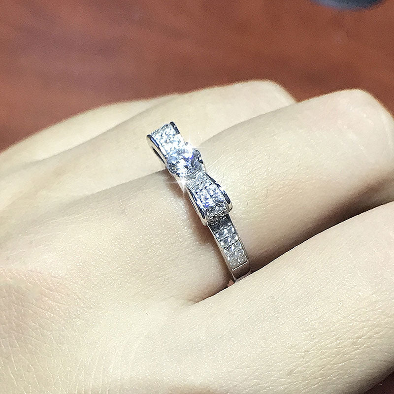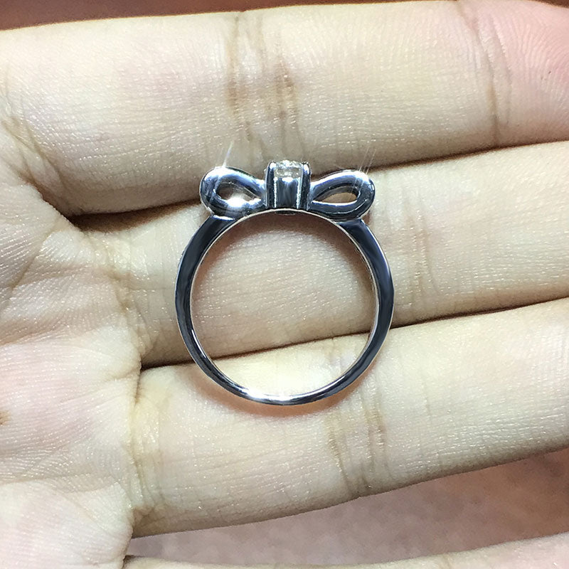 Delight and dazzle with this unique 0.3 carat Moissanite Diamond Stackable Ring. Crafted from white gold plated sterling silver. this spectacular bow shaped wedding ring is sure to make her heart skip a beat! Make a statement and surprise her with this one-of-a-kind ring.