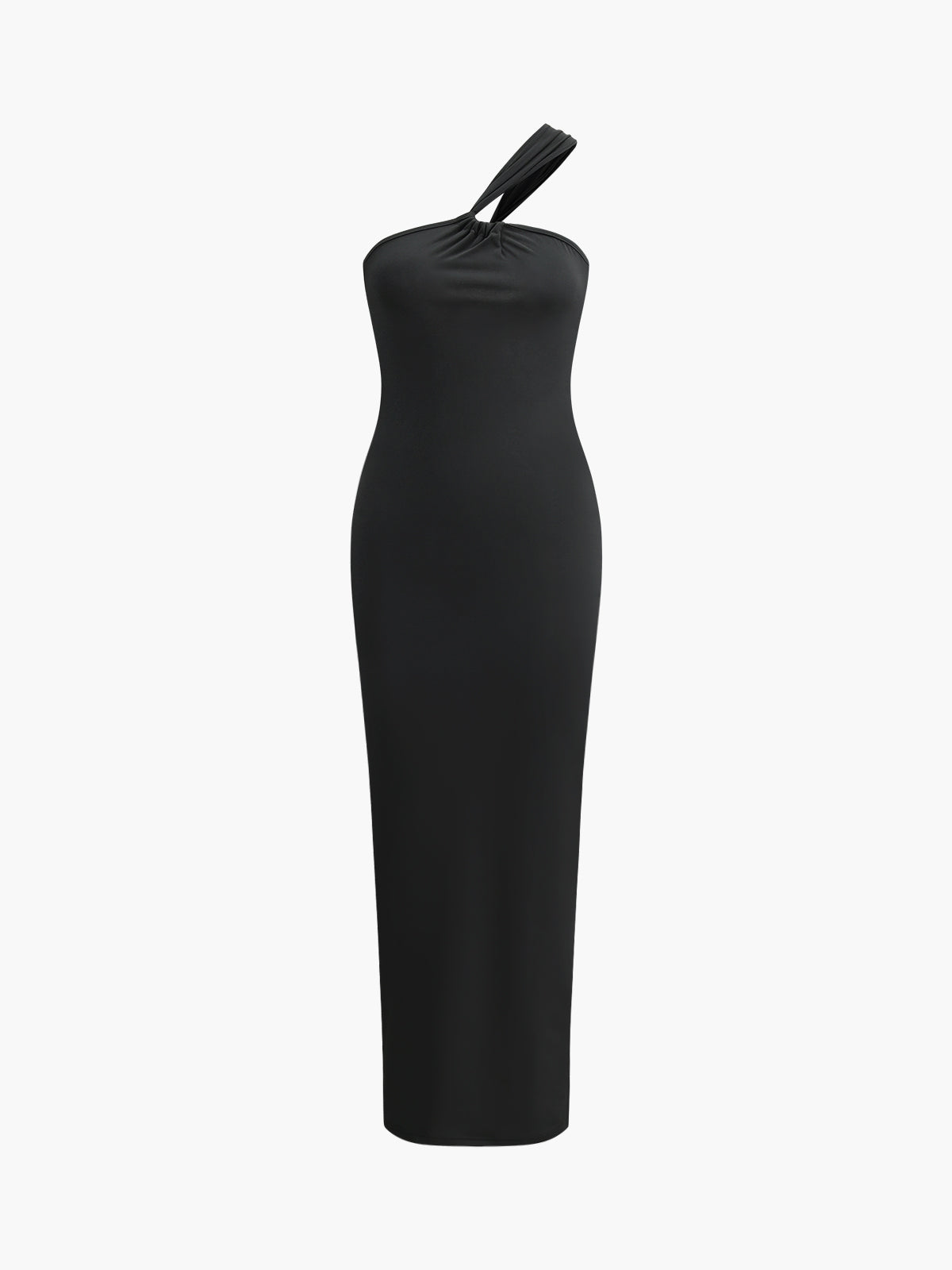 Women's Solid Color Long Sleeve V Neck Off Shoulder Dress with Pleating