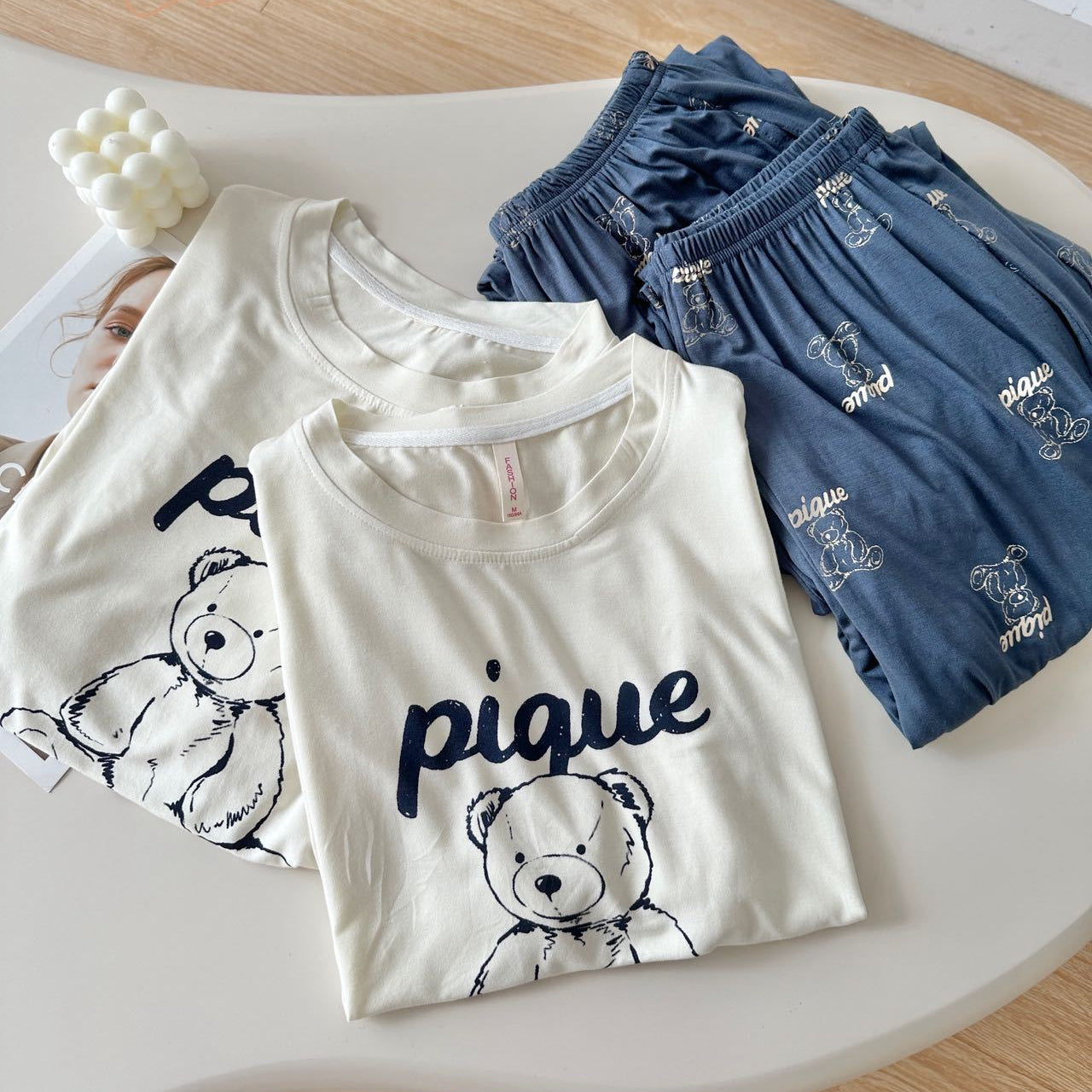 A: This set features a charming. sketch-style bear with a clean aesthetic that feels both playful and modern. The coordinated design—with a large graphic on the top and a subtle all-over print on the bottom—is a sophisticated take on the character theme.