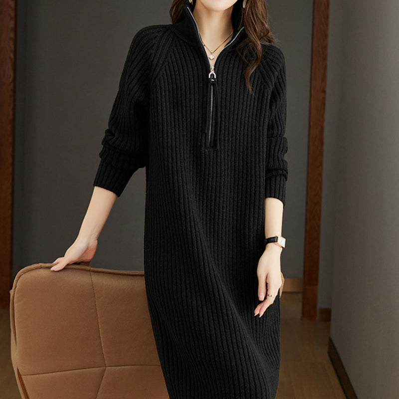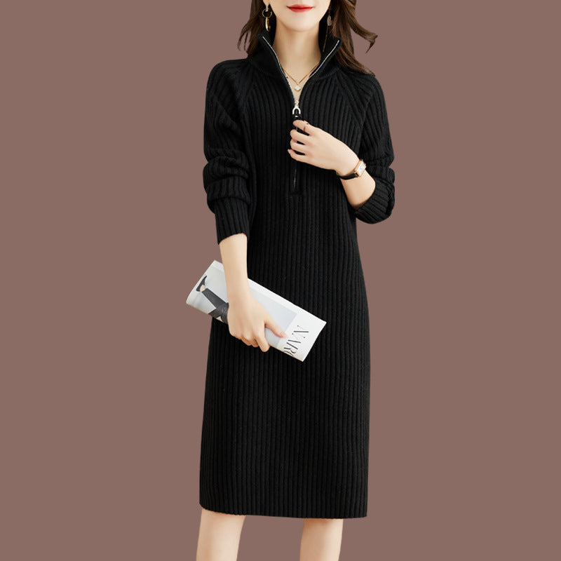Solid Knitted Stand Collar Fashion Loose Thick Elegant Sweater Dress
