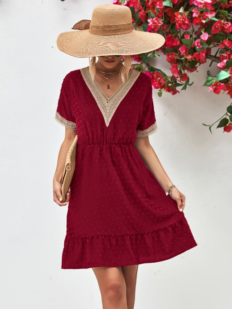 Decrease quantity for Summer Fashion Solid Polka Dot Lace Casual V Neck Elegant Party Mini Dress